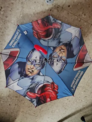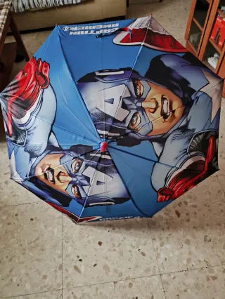 Paraguas con diseño de Capitán América para niños. Es un accesorio divertido y práctico. - Ilustración de Capitán América. - Mango y puntas en color rojo. - Automático.