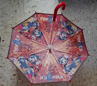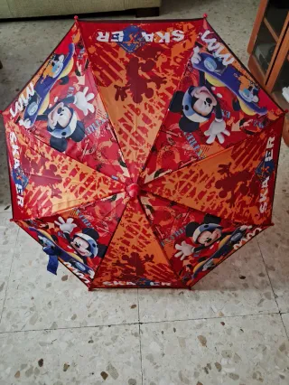 Paraguas infantil con diseño de Mickey Mouse skater. - Diseño alegre y colorido. - Ideal para protegerse de la lluvia. - Donde abrocha para que quede recogido,se puede poner el nombre del niño/a para identificarlo.