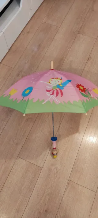 Paraguas infantil con un diseño alegre y colorido, perfecto para los días de lluvia. - Ilustración de un hada bailando rodeada de flores. - Borde inferior con diseño de hierba verde. - Mango de madera con un pequeño adorno. - Varillas de metal.