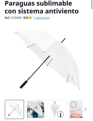 Paraguas blancos con sistema antiviento. - Ideal para sublimar y personalizar. - Mango ergonómico. - tamaño grande - 8 paneles de poliéster 190T - Mango recto y cierre de velcro - Abertura automática - Área de impresión (por panel): 46,5 x 66 cm Los compré por error pensando que serían plegables. Se pueden usar sin estampar, estan sin estrenar. Su precio original es de 4,85€/unidad. Vendo los 3 por 10€