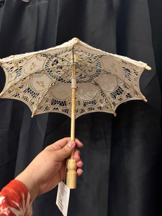 Este es un delicado paraguas de encaje, perfecto como accesorio decorativo. - Diseño de encaje intrincado. - Mango de madera. - Color marfil y blanco.