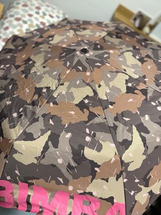 Paraguas de la marca BIMBA con un diseño de camuflaje y detalles en rosa. Usado super poco Funda impermeable para guardarlo