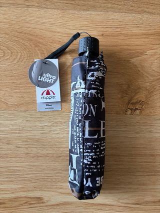 Paraguas plegable de la marca Doppler con diseño moderno. - Tejido con estampado de texto. - Asa con correa para colgar. - Mecanismo de apertura manual.