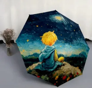 Precio NO Negociable ...!!! Paraguas con un bonito diseño ... El Principito observando la noche estrellada. Con el marco de fibra de vidrio y el toldo de alta calidad, son lo suficientemente firmes como para soportar vientos de más de 50 mph. Diseñado y fabricado profesionalmente, te protege perfectamente en días de lluvia con mucho viento. Paraguas diseñado con un mecanismo de apertura automática rápida, de un solo toque. Con solo apretar un botón, el paraguas se abrirá automáticamente, y al presionar de nuevo, el toldo también se plegara. Nuevo por estrenar. Precio Cerrado.