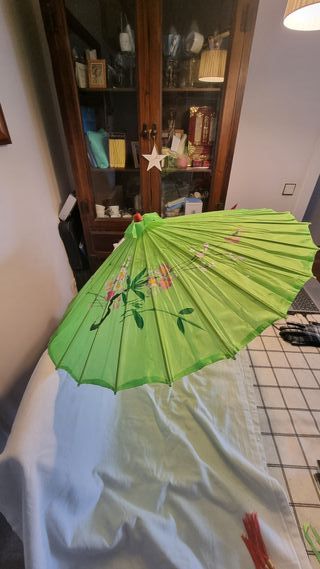 3 Paraguas de estilo tradicional japonés, con un diseño floral pintado a mano. Paraguas decorativos. - Color principal verde vibrante. - Detalles en rosa y blanco en las flores. - Estructura delicada y elegante. 1 paraguas por 5 euros, los 2 por 10 euros.
