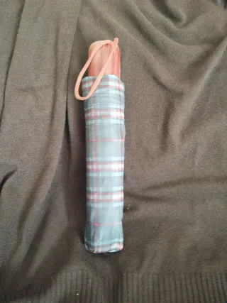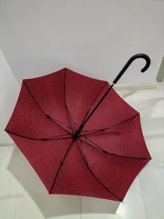 Paraguas compacto y práctico, ideal para llevar en el bolso o mochila. Aún conserva su embalaje original. - Diseño plegable. - Color burdeos y detalles en marrón.