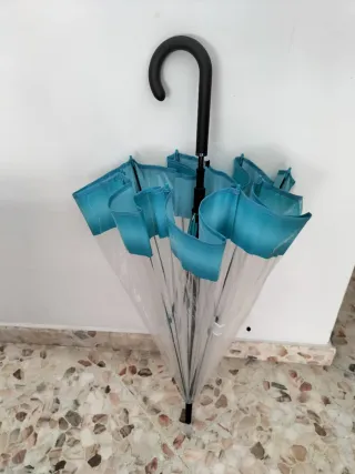 El paraguas y bolso a juego (son del mismo color) están nuevos, sin estrenar y con su etiquetas originales. El paraguas 🌂 mide 60cm (sólo la tela). Tiene 16 varillas, apertura automática, tela de fibra de vidrio resistente al viento. Está diseñado en España. REGALO: El bolso 👜 es de rafia con detalle de lazo de tela morada y adornos turquesa. Tiene bolsillo interior con cremallera, cierre de imán 🧲 - Cadena metálica para colgar el bolso. Si quiere sólo 1 articulo, se lo vendo. Precio negociable