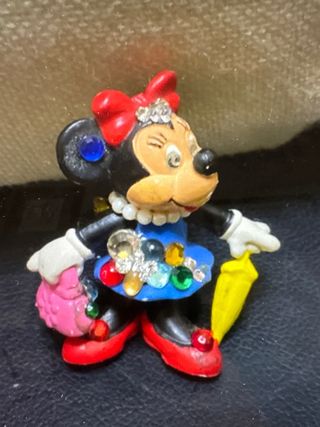 Este encantador broche de Minnie Mouse es un accesorio divertido y llamativo. - Diseño detallado de Minnie Mouse. - Adornado con pedrería de colores. - Incluye un pequeño paraguas amarillo. - Lleva un bolso rosa en la mano.