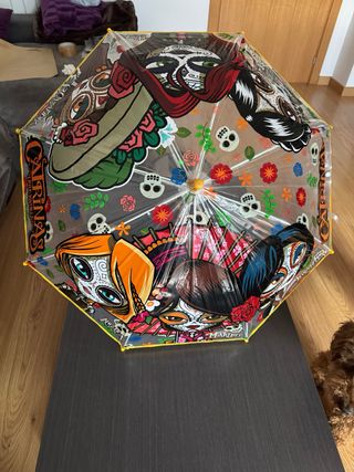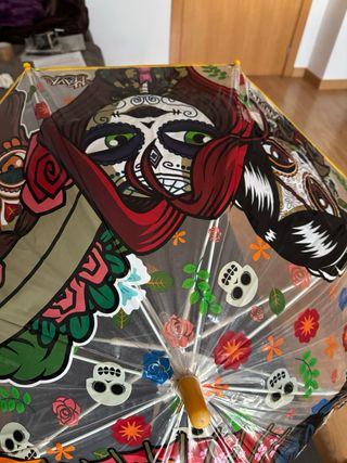 Paraguas con un diseño vibrante y artístico de Catrinas. - Diseño de Catrinas y calaveras. - Estructura transparente con detalles coloridos. - Borde amarillo.