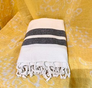 Fouta de algodón con un diseño de rayas en dos tonos. Es un accesorio versátil y ligero. - Tejido de algodón. - Diseño a rayas. - Flecos en los extremos.