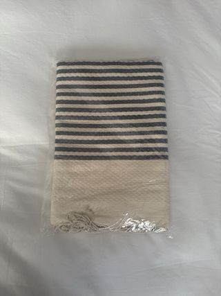 Toalla/pareo de playa tamaño extra grande 240 x 210. Color azul y blanco a rayas con flecos blancos. Marca Momomus . - Tejido suave y ligero. - 100% algodón. - Perfecta para la playa, piscina, pícnics... En perfectas condiciones, sólo se ha usado este verano. Recogida en el Cap Bordeta Magòria.