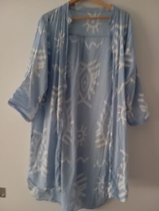 Camisola de playa azul y blanca. Manga larga con sistema para remangar fácilmente. Puesta 1 vez.