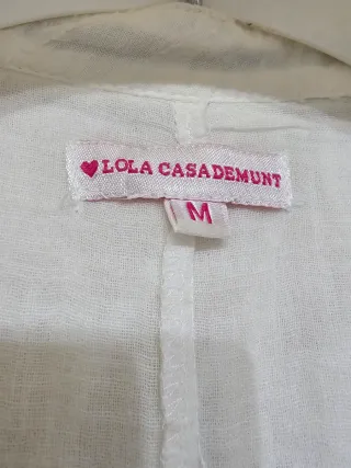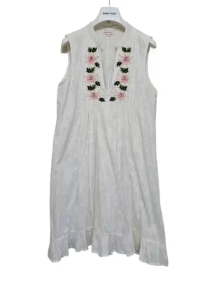 Vestido blanco sin mangas con detalles florales bordados en el escote. - Escote en V con bordado floral. - Bajo con volante. - Tejido texturizado. Brand: Lola Casademunt Size: M Composition: 100% Cotton (lined in Cotton) Colour: White with pink + green details Condition: Excellent, barely worn. no defects. Measurements: 85cms long 46cms across chest