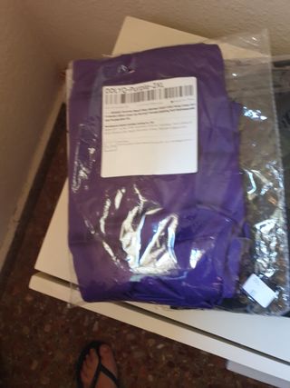 Pareo a rayas verticales en tonos morados, azules y blancos. Talla M, aunque también podría servir para S y L. Está nuevo, no me lo he puesto en ninguna ocasión.