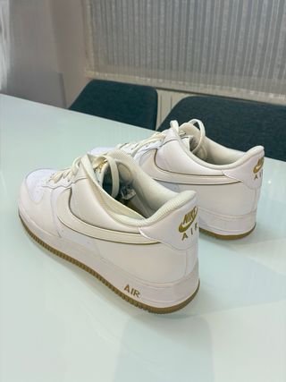 Zapatillas Nike Air Force 1 con detalles en dorado. - Exterior de cuero blanco. - Suela de goma marrón. - Detalle del logo Swoosh en dorado. - Inscripción AIR en la suela.