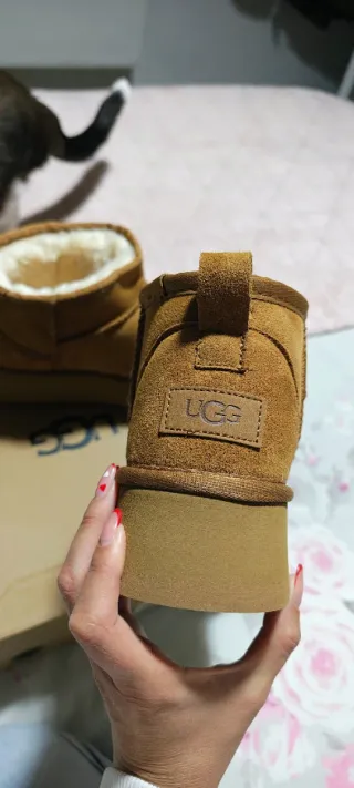 Botines de ante color marrón. Talla 39 pero equivale a un 38, ya que con el pelo de dentro tallan justas. - Detalle de logo UGG en la parte trasera. - Forro interior de borreguito.