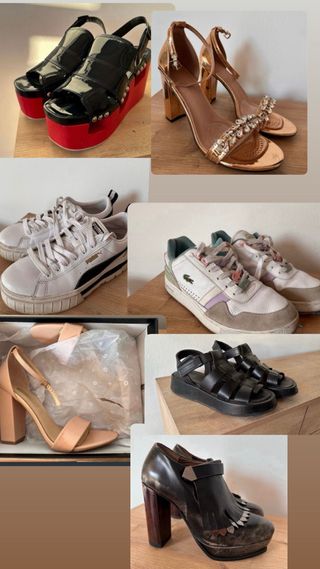 Lote de siete pares de zapatos (usados). Todos para pie que calce talla 39. 1) Puma Mayze (precio original: 110€) 2) Lacoste (precio original: 120€) 3) Sandalias de piel compradas en la Toscana (precio original: 80€) 4) Tacones Primadonna color nude (precio original: 80€) 5) Tacones Adolfo Dominguez (precio original: 130€) 6) Tacones Shein (por el precio que costaron, las regalo) 7) Plataformas Jeffrey Campbell (precio original: 270€)