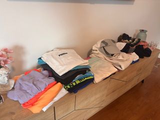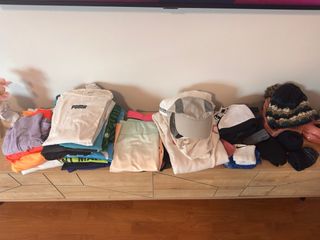 37 Prendas mayoritariamente talla S/M. - 2 faldas de pádel/tenis (1 de ellas Lacoste) - 2 vestidos de pádel/tenis (ambos de marca: Ellesse y South Beach) - 15 camisetas (3 de ellas de marca: Nike, Adidas, Puma) - 3 leggings (1 de ellos Puma) y 1 short - 1 chándal completo Asics color hueso y rosa (manga larga y pantalón largo) - 3 tops deportivos (1 de ellos Nike) - 2 gorros (1 de ellos North Face con pelito suave por dentro) - 1 bufanda - 1 braga de cuello/pelo para montaña - 2 muñequeras (1 Nike) - 2 pares de calcetines largos de voleibol (o para cualquier otro deporte como hockey, fútbol, etc.) - 1 par de guantes - 2 gorras