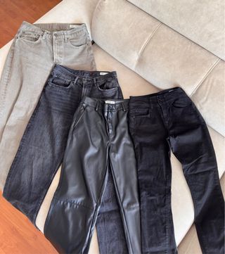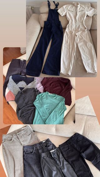 Conjunto de 13 prendas variadas para entretiempo e invierno, la mayoría marcas Inditex y Salsa Jeans. Partes de arriba talla S. Partes de abajo talla 38. -5 pantalones (2 Zara, 1 Salsa Jeans efecto push-up precio original 80€, 1 Pull&Bear, 1 Mango) -1 peto tejano Salsa Jeans (precio original 140€, talla 36, 99% algodón) -1 mono color hueso Mango pantalón largo y manga corta, con cremallera. Muy cómodo. -1 chaqueta tejana Pimkie -1 rebeca color violeta Mango -2 jerseys Mango -1 Jersey Tommy Hilfiger -1 camiseta manga larga Mango Se valoran ofertas.