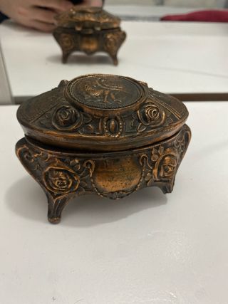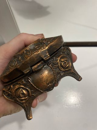 Precioso cofre joyero de estilo antiguo, con un diseño intrincado y detalles ornamentales. UNA DE LAS PATAS MEDIO ROTA,muy pesado y antiguo - Elaborado en metal con acabado en bronce. - Decorado con motivos florales y un medallón central. - Base con patas curvas.