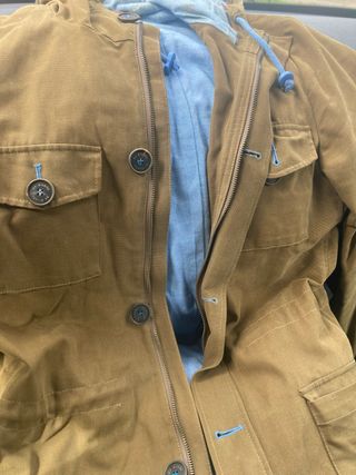 Parka/abrigo de mujer en color Kaki en buen estado . Tiene capucha forrada de pelito que desciende por el cuello y se puede quitar mediante botones. También tiene un chaleco de quita y pon mediante botones a presión Perfecta para el día a día. Talla amplia,aunque ponga talla S sirve bien para una M - Capucha con pelo sintético. - Cintura ajustable con cordón. - Bolsillos frontales con solapa y cremallera. - Cierre principal de cremallera y botones a presión.