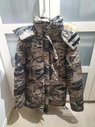 Vendo parka de mujer en color beige (arena), ideal para los días más fríos. Es de la marca Jump Around y está en perfecto estado, muy poco uso. Talla: M (talla normal, queda muy bien entallada gracias a los cordones ajustables). Capucha: Gran capucha fija con pelo sintético de alta calidad, muy suave y denso (estilo nórdico). Detalles: Cierre de cremallera y botones para mayor aislamiento. Bolsillos frontales amplios con cierre de botón. Detalle de parche bordado en la manga izquierda que le da un toque urbano y moderno. Puños elásticos en las mangas para que no entre el aire. Estado: Limpia y cuidada, sin ningún tipo de desgaste.