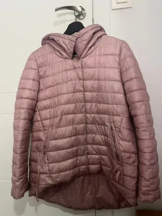 Parka acolchada con capucha en un bonito tono rosa palo. Es ligera y perfecta para el entretiempo. - Diseño acolchado. - Capucha integrada. - Cremalleras en los bolsillos laterales. - Bajo asimétrico.