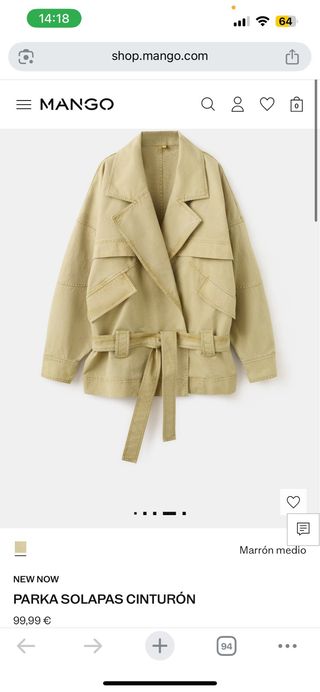 Parka de entretiempo de Zara. - Diseño con cinturón. - Bolsillos frontales.