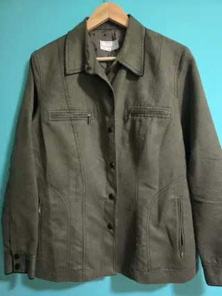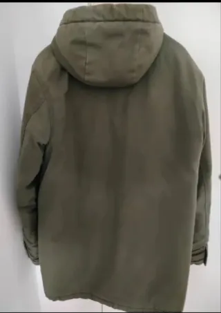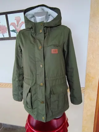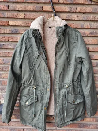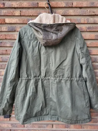 Abrigo estilo parka en verde oscuro con forro interior desmontable de borreguito. Su talla es L, pero en realidad es como si fuera una S-M o talla 36-38. Ideal para colegio. - Cierre de cremallera. - Bolsillos frontales con solapa. - Cordón ajustable en la cintura. - Capucha con forro de borreguito.