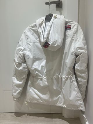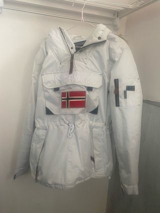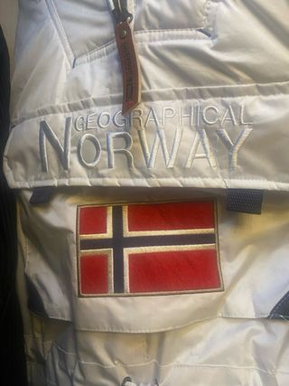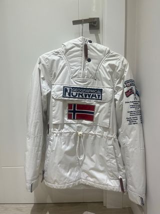 Parka Geographical Norway de color blanco. - Diseño con capucha. - Bolsillo frontal grande. - Cierre de cremallera y botones. - Detalle de la bandera de Noruega en el pecho. Usada 2 veces pero al ser clara tiene alguna marca que habria que limpiar. Muy abrigada.