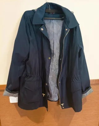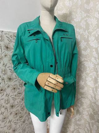 Parka ligera de entretiempo. Con capucha. Puesta dos veces. 4 bolsillos funcionales con solapa. Dos cierran con corchetes. Ajuste interior en la cintura. Ajuste en el bajo Cierre con cremallera y corchetes ocultos. Ningún defecto. 37 cm de hombro a hombro 43 cm de sisas 79 cm de largo