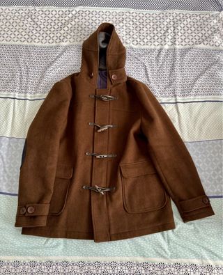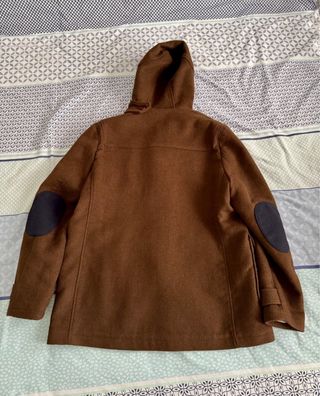 Parka de estilo clásico con capucha y detalles distintivos. - Cierre frontal con tres pasadores de madera y cordón. - Bolsillos frontales con solapa y botón. - Puños con dos botones. - Parche de tela en el codo izquierdo.