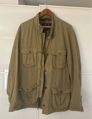 Marca: Lefties Estilo: Parka o cazadora, con un diseño que recuerda al clásico estilo Barbour británico Color: Kaki o verde militar Detalles: Cuello camisero de pana en un color de contraste (verde oscuro) y bolsillos delanteros amplios con solapa Material: Confeccionada en un tejido exterior resistente al agua, a menudo algodón encerado o materiales similares en modelos de este estilo Cierre: Cierre frontal con cremallera y botones a presión