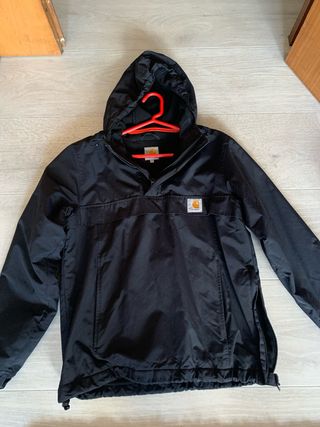 Chaqueta Carhartt Negra Estilo Parka-Barbour Talla M Forro interior en tela escocesa y capucha Es una prenda impermeable y caliente.