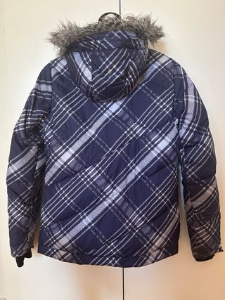 Abrigo acolchado con capucha de Columbia. Presenta un diseño a cuadros y detalles de pelo sintético en la capucha. - Cierre de cremallera frontal. - Bolsillos laterales con cremallera. - Puños elásticos. - Relleno pluma.