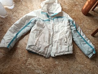Abrigo plumas nieve, talla 14/ 16 años. Está prácticamente nuevo,es muy calentito. Color blanco, con rayas azules, con capucha.