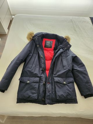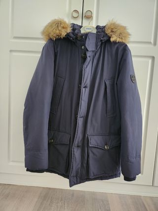 Vendo parka de hombre plumífero de Tommy Hilfiger, en color azul marino talla pequeña (S). Está en perfecto estado, no tiene nada roto. Las cremalleras funcionan perfectamente. Tiene cuatro bolsillos por la parte frontal, dos abajo con solapa y cierre de botón y otros dos a media altura (ver fotos). Bolsillo interior. La capucha se puede desmontar y el pelo de la capucha también. La calidad del plumón es buena, porque la parka abriga bastante. Hago envíos.