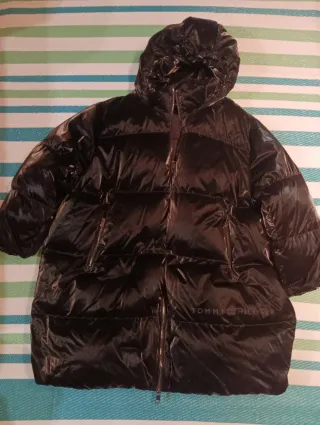 Cazadora acolchada de Tommy Hilfiger. - Diseño brillante en nuhro - Capucha integrada. - Cierre de cremallera frontal. - Bolsillos con cremallera. Las cremalleras aún conservan el plástico protector por el poco uso que ha tenido. Es de plumón y plumas por lo que abriga mucho. Largo 90 cm Ancho sisa 75 cm
