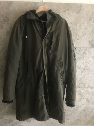 Parka estilo militar de Pull&Bear, aún con su etiqueta. - Diseño con capucha. - Cierre de botones. - Bolsillos frontales. - Detalles de insignias en las mangas. - Inscripción P.B. ST FORCE en el pecho.