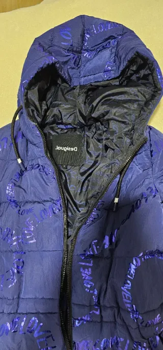 Anorak Desigual con un diseño llamativo y moderno. - Color morado vibrante con estampado de letras. - Capucha integrada. - Cierre de cremallera frontal. - Puños elásticos en las mangas.