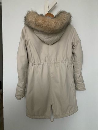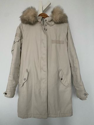 Abrigo largo tipo parka de color beige con detalles de pelo en la capucha. - Cierre de cremallera y botones. - Bolsillos frontales con solapa. - Puños elasticos con botones. - Detalle de bolsillo en manga izquierda. - Capucha con accesorio de pelo desmontable con botones Usado solo una temporada.