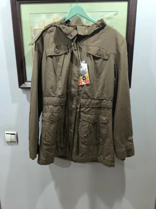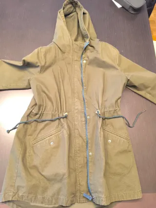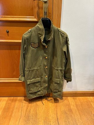 Chaqueta estilo parka militar de la marca Stradivarius. Entretiempo - Diseño con capucha. - Cordón ajustable en la cintura. - Bolsillos frontales con solapa. - Cierre de cremallera y botones. Medidas en fotos Color real el dd la primera foto