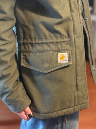 Parka Carhartt de color verde militar, ideal para el frío. Cuenta con capucha y múltiples bolsillos. - Cierre de botones y cremallera. - Bolsillos frontales con solapa. - Detalle de logo en manga. - Puños ajustables. Tiene una pequeña quemadura que no se nota en una de las mangas