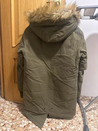 Parka de la marca H&M LOGG en color verde. Parka verde militar, exterior 100% algodón, forro interior de poliéster. Marca L.O.G.G 2 Bolsillos laterales, 2en el pecho y un bolsillo interior. Cordón para ajustar en la cintura y en el bajo. Cierre con botones y cremallera. Está en buen estado, solo tiene un pequeño rasgado en la espalda que se puede coser fácilmente, además lo tapa la capucha. Y a la capucha le falta el pelito que llevaba enganchado con velcro. Recién lavada en lavandería. 72 cm largo 62 cm largo brazos 45 cm ancho hombros 56 cm cintura (ajustable cordones)