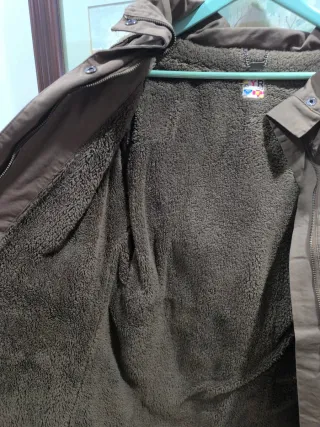 Parka de la marca Local con forro interior de borreguito. - Color verde militar. - Cierre de cremallera y botones. - Capucha integrada. - Bolsillos frontales.