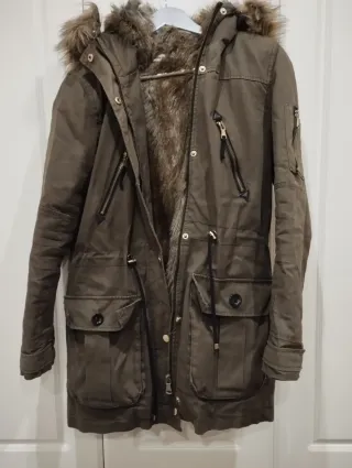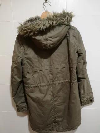 Abrigo Parka con capucha verde caqui Bershka Muy cálido Con forro interior de pelo extraíble Cordón ajustables en la cintura Pequeño desgaste en los puños Talla XS completa