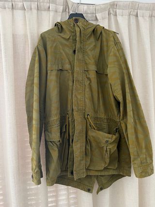 Parka estilo militar de Zara. - Diseño con estampado de camuflaje. - Cierre de cremallera y botones. - Bolsillos frontales. - Cordón ajustable en la cintura.