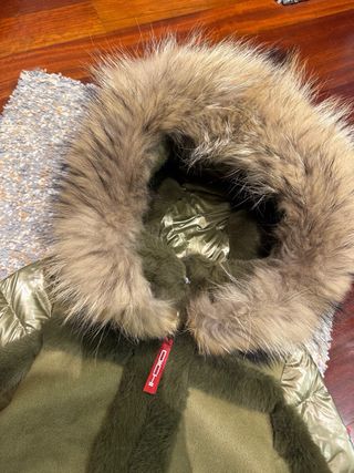 Parka de la marca Dichi en talla 36. Una prenda con un diseño moderno y detalles únicos. - Capucha con pelo. - Combinación de materiales. - Acabados en pelo sintético.