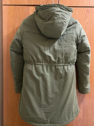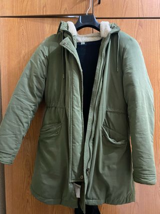 Abrigo/ Parka, con capucha, verde militar. Está forrada y abriga. Mide 87 de largo.