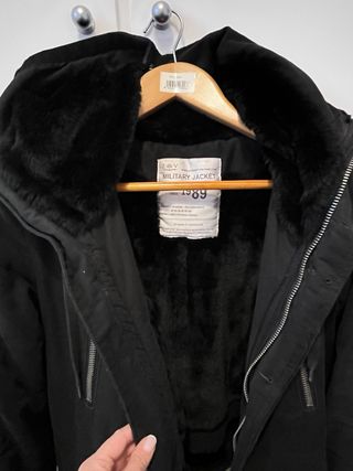Parka verde militar con forro de pelo muy suave y calentita. Es una talla 16 pero equivale a una S de mujer